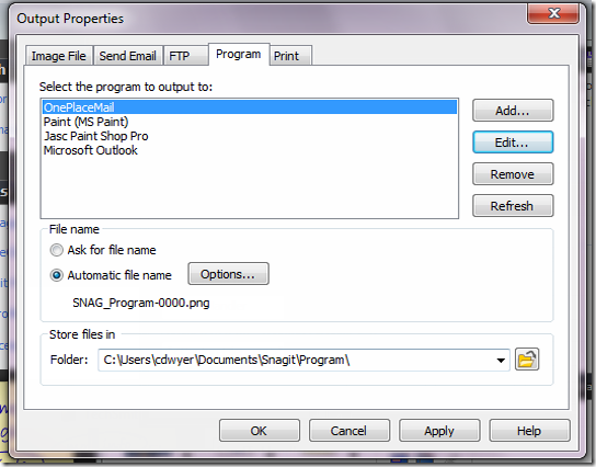 This procedure will configure a Snagit profile for OnePlaceMail. This allows you to take a capture using Snagit and save the result (without editing) directly to SharePoint using OnePlaceMail.