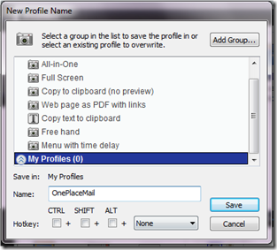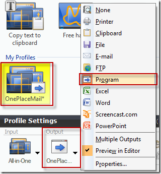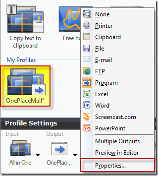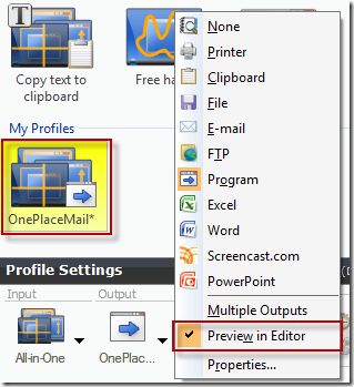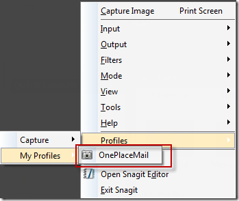 1. Now you just need to choose the active profile. Snagit gives you many ways to do this. One way is to click on system tray icon | Profiles | My Profiles | OnePlaceMail