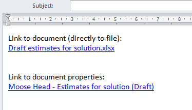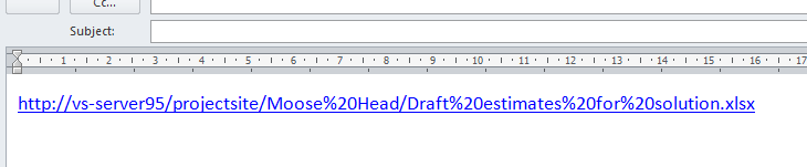 The link is then automatically insert into the email and you are ready to send. As an added bonus the location you saved the file to has the Document Id feature enabled so the link uses the static URL provided by the Document Id feature.