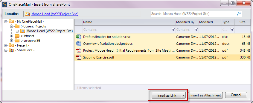 Then select the SharePoint file(s) from the OnePlaceMail Insert window and choose to Insert as Link