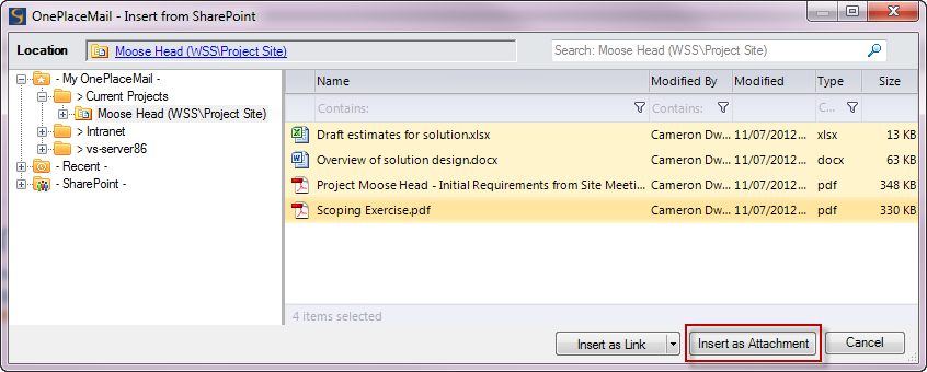 Including documents as attachments is just as simple as inserting links, on the Insert from SharePoint window simply select one or more documents and click Insert as Attachment.