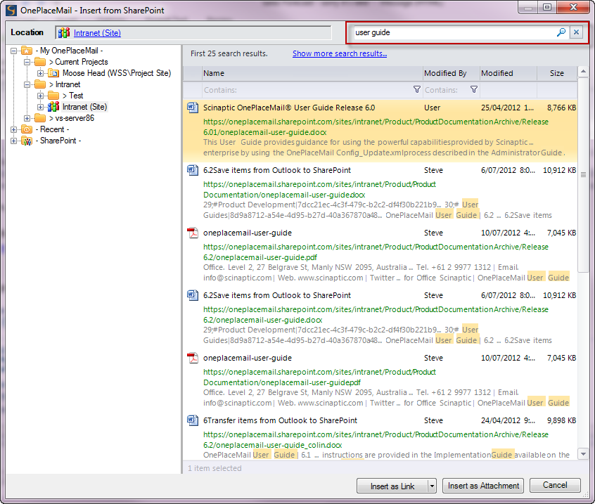 Not sure where that files is in SharePoint? Either you didn’t create it and put it into SharePoint, or you’ve long since forgotten where you put it. No problem, the Insert from SharePoint window provides an awesome search tool complete with hit-highlighting of results and scoping search to site-collection, site, or library/list.