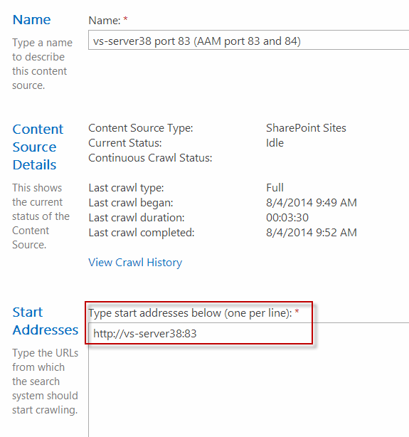 The search content source is configured to crawl the content based on the default http://vs-server38:83 URL.
