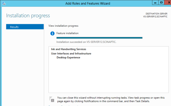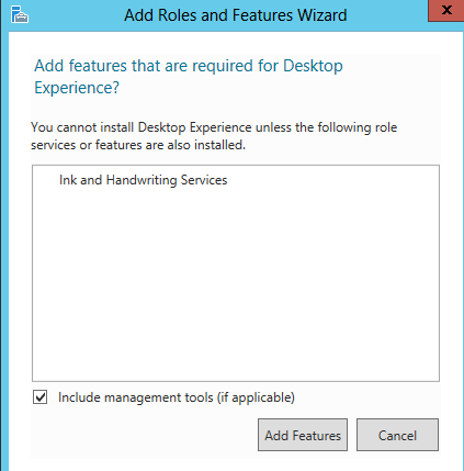 Check Desktop Experience and you will be prompted to also install the pre-requisite Ink and Handwriting Services. Click Add Features.