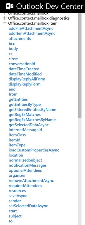 To give you an idea of what I mean, here is a list of properties that are available on the Office.context.mailbox.item object (according to the API documentation in the Outlook Dev Center)