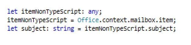We can declare an object in Typescript without a specific type by specifying it’s type as any. If we do this to an object within the Office.js library we can get an un-typed handle to the object. As the object in now un-typed, we can call any property of that object we like (whether it exists or not). Below is the code that will give us access to the subject of the email that is not available in the Typescript definition file.