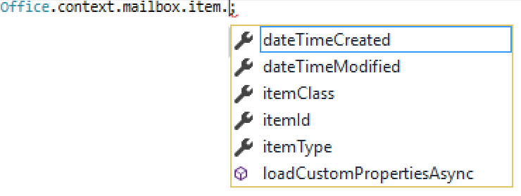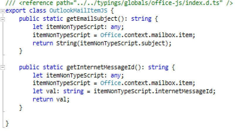 It would get a bit unwieldy if you used this technique throughout your code, and I’d like to think that as we get updated Office.js Typescript definition files that we can remove this type of code from our project and access the properties in a properly typed way. To isolate your use of this technique to a central location and facilitate removing the code later on, I’d suggest creating a class that takes in the object (e.g. Office.context.mailbox.item) then inside the class it gets the un-typed handle to the item and provides methods or properties that return the missing properties (with the bonus that the values returned can have a type associated with them). Below is an example of a class with static methods that provide typed access to missing properties on a mailbox item.