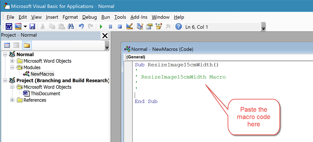 You will now be dropped into the VB Macro Editor experience which looks nothing like Word! Don’t worry you just need to paste the following code in as shown