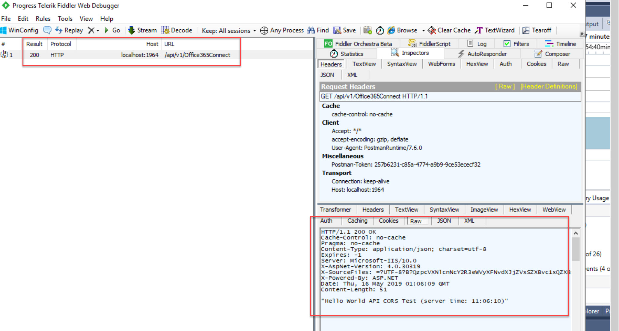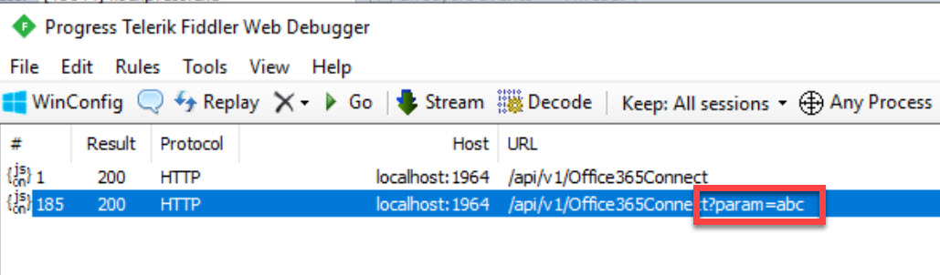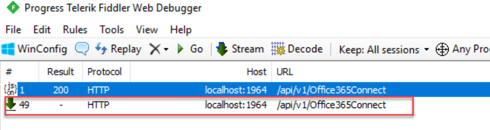 Imagine we are trying to debug this, we run the project on our dev machine with a breakpoint in the controller code. Then we need to trigger our method by using whatever the front-end app is. If we have Fiddler running we will be able to see this request come through from the front-end app to our controller method.