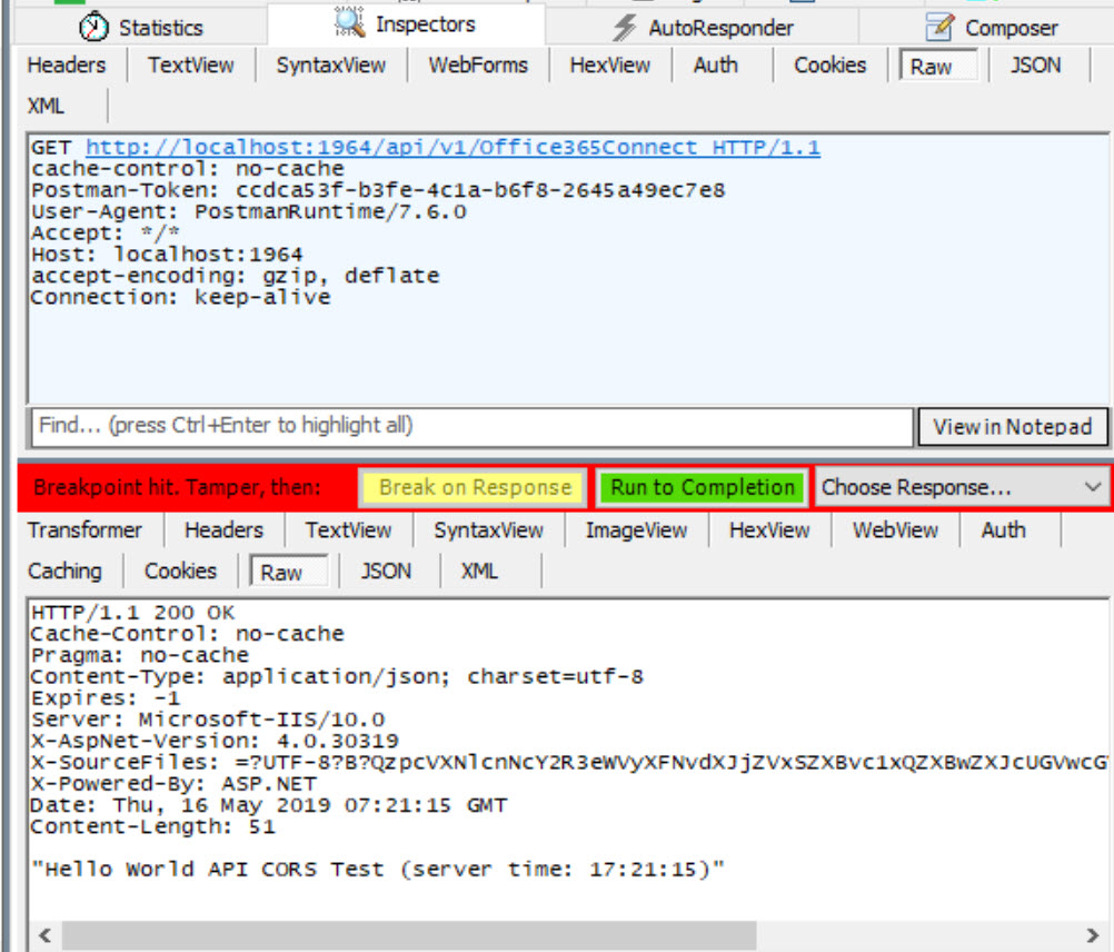 We can then manipulate the content of the response before clicking Run to Completion at which time the response is passed back to the calling application.