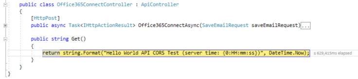 Here we can see our front-end app is making a call to our service (Web API controller from the previous examples). We can see the response of this request at the bottom right of the image where we return “Hello world…” and the server time.