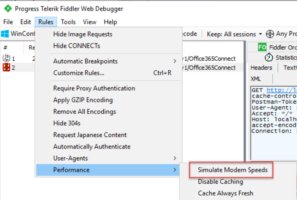 Want to know how your app behaves over a slow connection or if a service you are calling takes a long time to respond? Fiddler makes this super easy. Since all requests from your code are going through Fiddler, you can simply delay the requests being issued under Rules | Performance | Simulate Modem Speeds