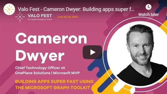 https://youtu.be/YNimSWQ72UE YouTube hosted recording of Building Apps Super Using The Microsoft Graph Toolkit session by Cameron Dwyer You can also view all the other awesome sessions from Valo Fest 2020 on YouTube