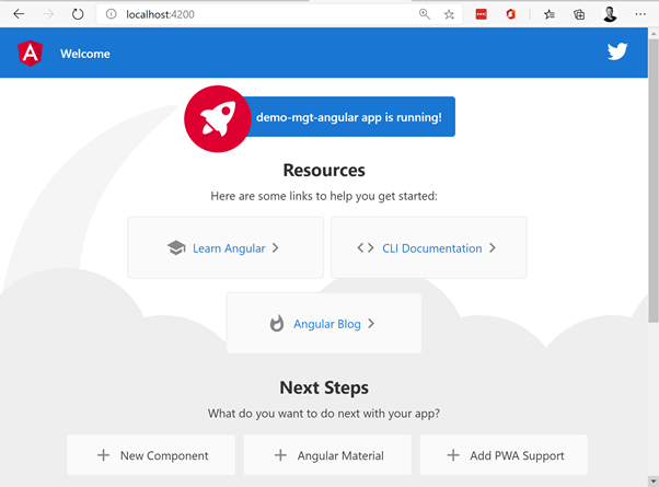 From here you should be able to build and debug the default app using the ng serve command and opening a browser to http://localhost:4200