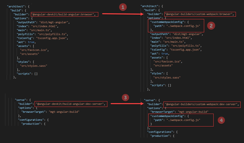 1 – In architect|build section change builder from “@angular-devkit/build-angular:browser” to “@angular-builders/custom-webpack:browser”