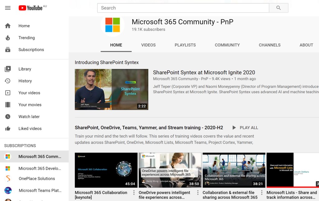 There’s way more community calls being run by the product groups within Microsoft than I could ever keep up with. The most consolidated list I can currently find is at https://pnp.github.io/. If, like me, you live in a time-zone where these calls all happen in the middle of the night then it’s good to know they get recorded and published on YouTube to channels that you can subscribe to which makes finding them super easy.