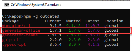 This will tell you all the npm packages that are outdated. In the case above you can see I’ve got the generator for Office installed but it’s not the latest version. Outdated packages will include both the Yeoman engine itself and any Yeoman Generators (since they are all just npm packages).