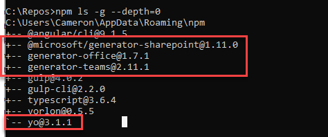 This lists all top level npm packages. Above you can see I’ve got a larger list this time that includes the Yeoman engine (Yo which is at version 3.1.1)