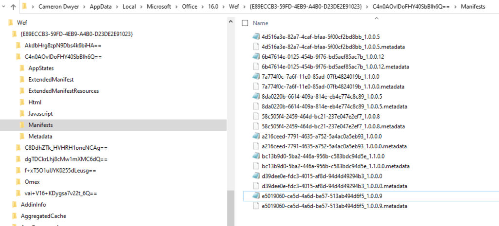 I’m also unclear on what the {opaque-hash} folder represents. I have a hunch it’s different Office accounts that you’ve logged in as (and obviously the manifest available to the users may be different)