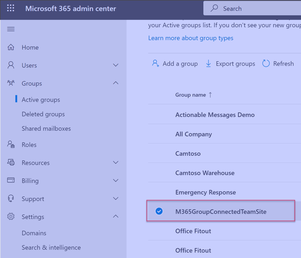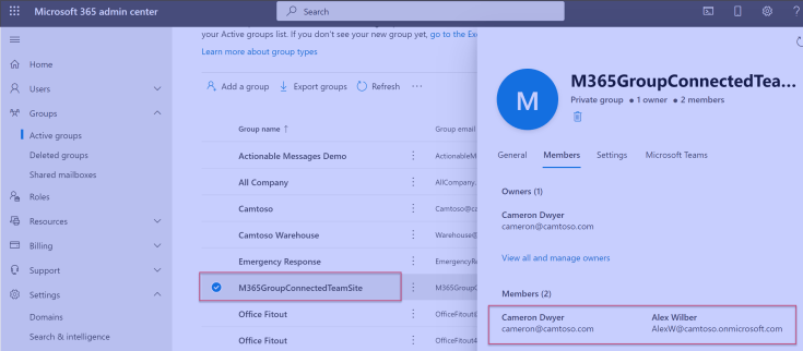So this is where that Microsoft 365 Group comes in. Rather than the SharePoint Group maintaining a list of members, it instead has the above reference that lists the underlying Microsoft 365 group. The membership is then driven by members of the underlying Microsoft 365 group which we can see below is visible from the Microsoft 365 Admin Center.