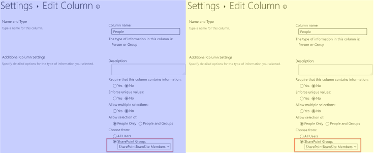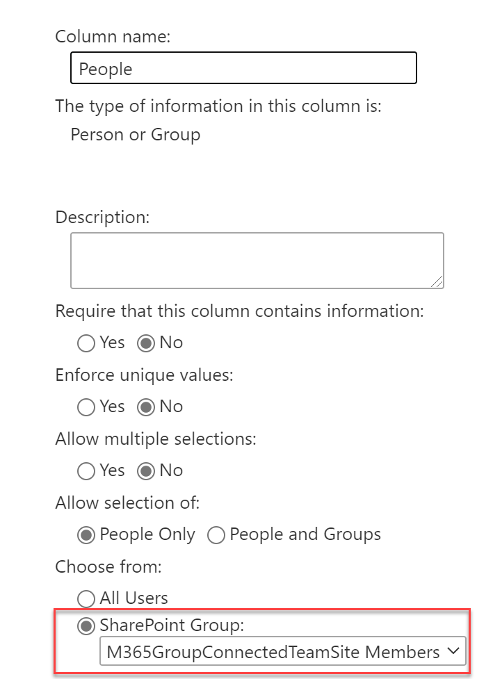 When you create a SharePoint site that is “groupified” e.g. a Teams site, then in addition to the 3 standard SharePoint site groups being created (Owners, Members, Visitors), a Microsoft 365 Group also gets created. It is these “groupified” groups that cause the problem when trying to restrict a people/groups column.