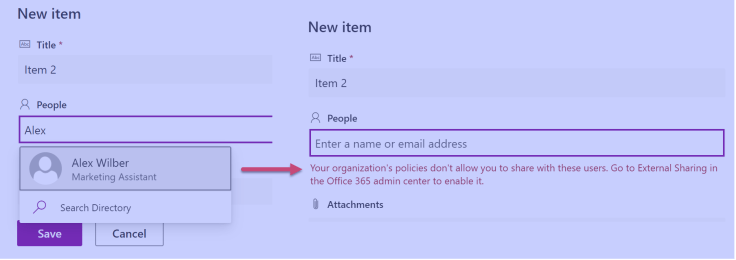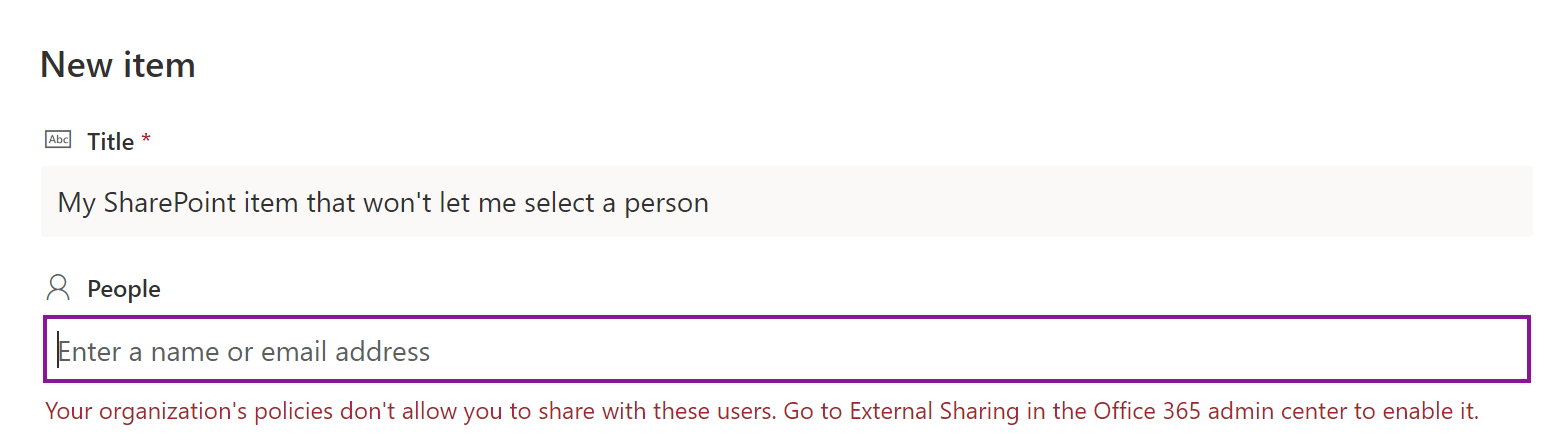 I found this error really hard to believe since I was using a demo tenant and had created the site and list with an admin user account and then I got this error just trying to select myself (the admin user). There’s no external accounts at play so the error just didn’t make sense.