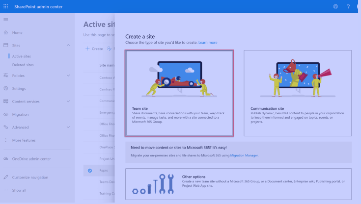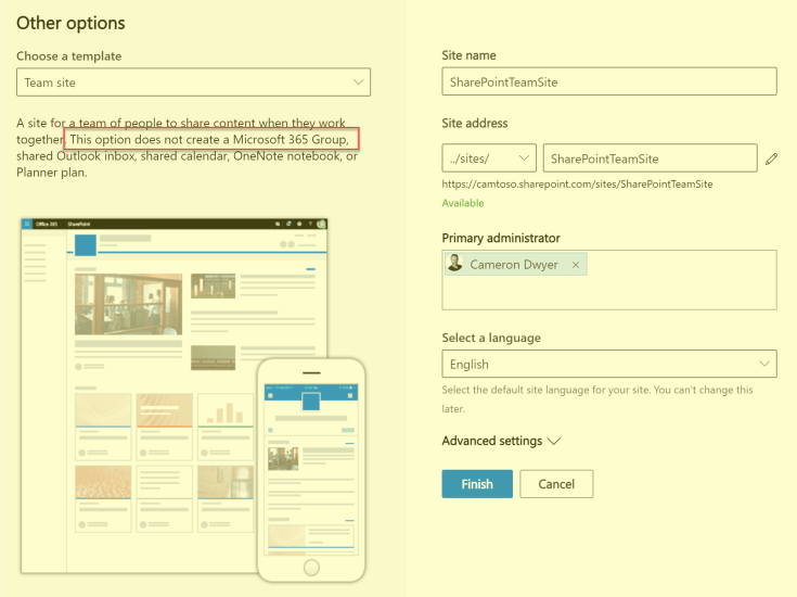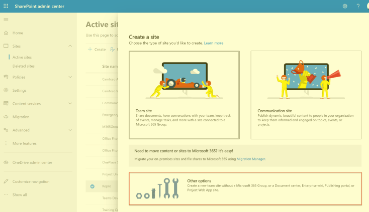 Now for comparison lets also create a standard SharePoint Team site (which doesn’t create a Microsoft 365 group). We do this by selecting Other option (rather than selecting the big Team site button) on the Create a site dialog. This standard SharePoint site will be coloured yellow for the rest of the article so we can easily distinguish between the 2 sites.