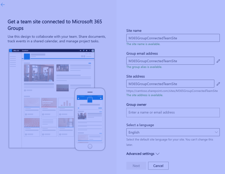 Firstly lets create a Team Site. A Team Site is a “groupified” site that will create a Microsoft 365 group. In the following walk-through the groupified Team site will be coloured blue.