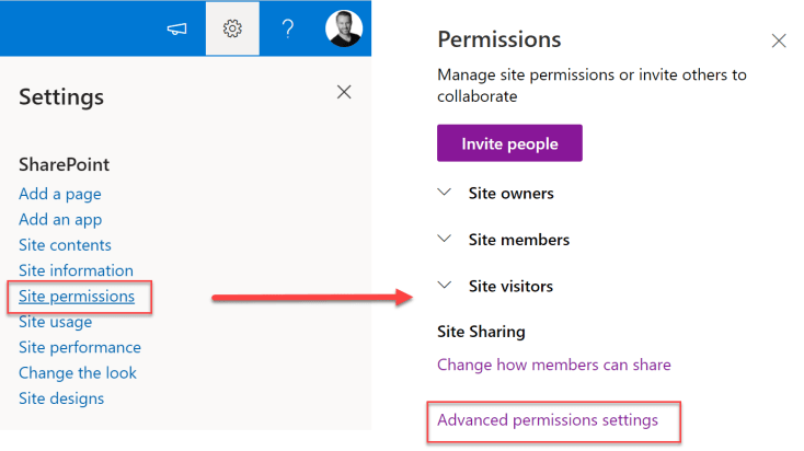 Now lets take a look at the difference in how the SharePoint groups got created. The process to view this is the same for both sites. Settings | Site Permissions | Advanced permissions settings.