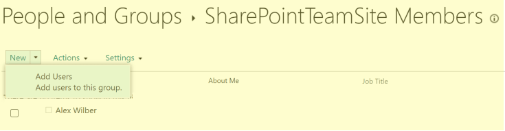 By comparison the non-groupified SharePoint site has no entries in the Members group and you can add members to this group directly in SharePoint as you would expect. Here I’ve added Alex.