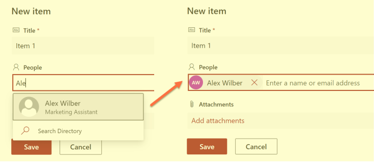 Time to see the end result. Firstly in our standard SharePoint site (non-groupified). We can start typing Alex, get type-ahead lookup and select Alex Wilber as you would expect.