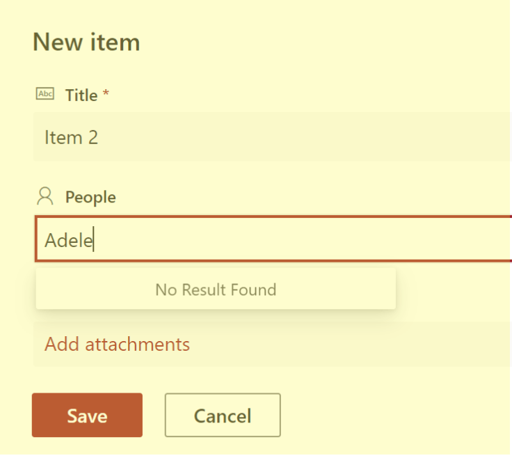 There is also a difference in the options returned from the type-ahead search for people. The standard site only returns results of people belonging to the group the column is restricted to. The example below shows that we cannot find a result for Adele (since Adele does not belong to the Members group).