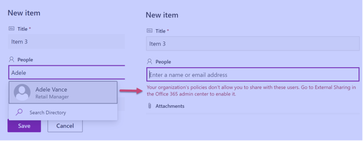 “Your organization’s policies don’t allow you to share with these users. Go to External Sharing in the Office 365 admin center to enable it.”