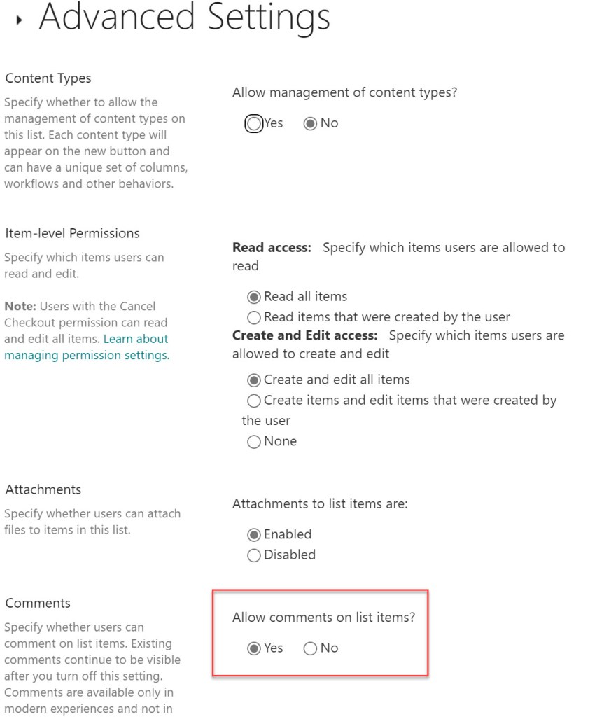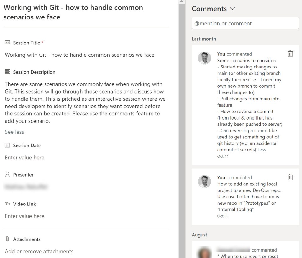 Under List Settings | Advanced Settings ensure Comments are enabled. This will allow people to to leave comments such as things they’d like to see in a session or questions they’d like answered. It helps the presenter engage with people before the session.