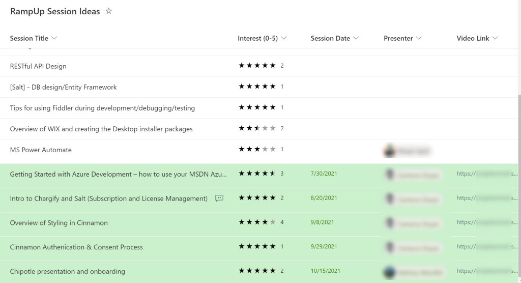 - Presenter – if a person want to present a session they should populate this when they create the list item, otherwise leave it blank until the session gets scheduled and a presenter is found/assigned