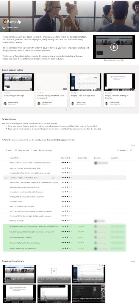 To give our RampUp program a home we can create a page on the Developers team SharePoint site. The main things I added to this page were: