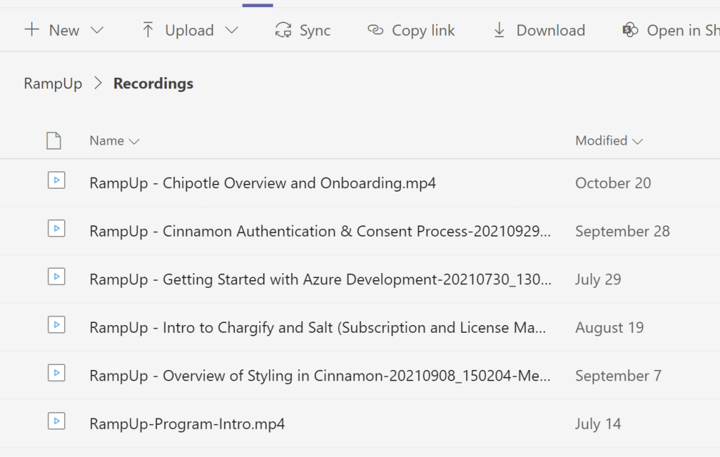 The important thing to note is that by scheduling the meeting directly in the RampUp channel, the recordings will automatically get saved into the same folder within the Documents library of the Team site.
