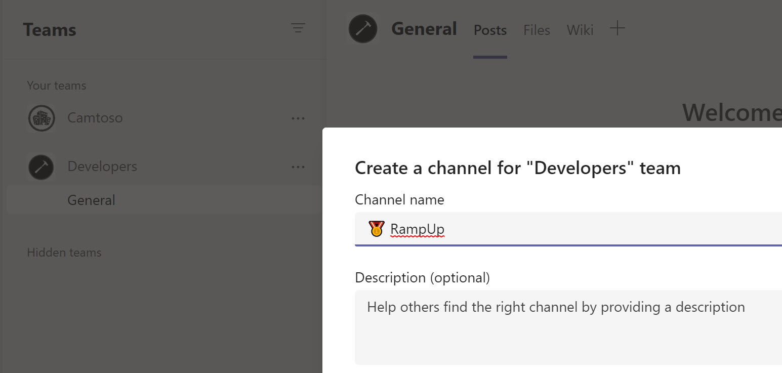 So let’s start by taking the existing Developers Team and adding a channel for the RampUp program.