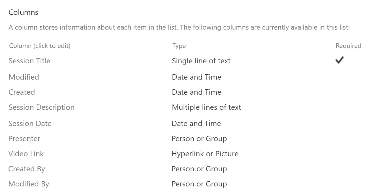 - Presenter – if a person want to present a session they should populate this when they create the list item, otherwise leave it blank until the session gets scheduled and a presenter is found/assigned