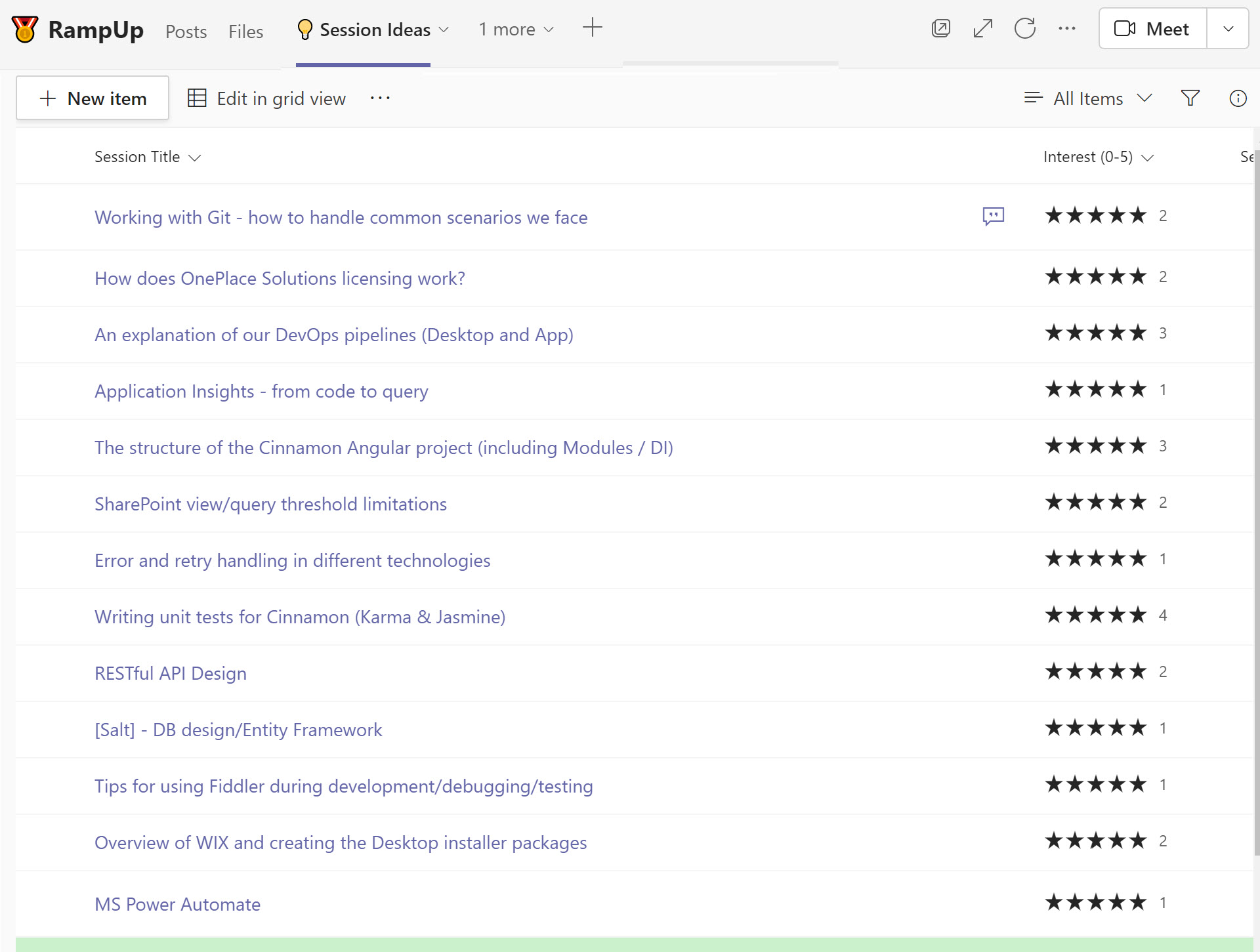 We can add our Session Ideas list to the RampUp teams channel (Add tab | List | Select the Session Ideas List)
