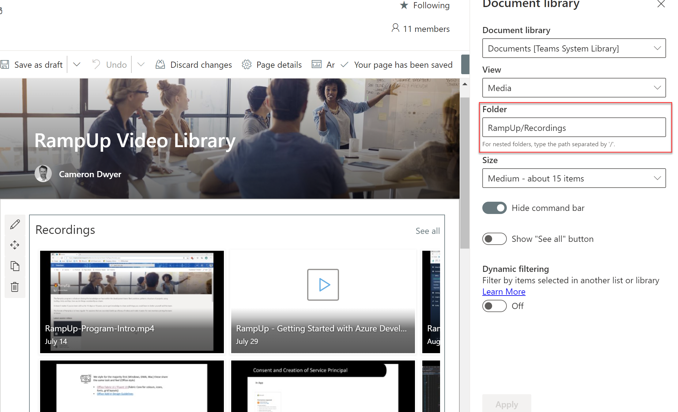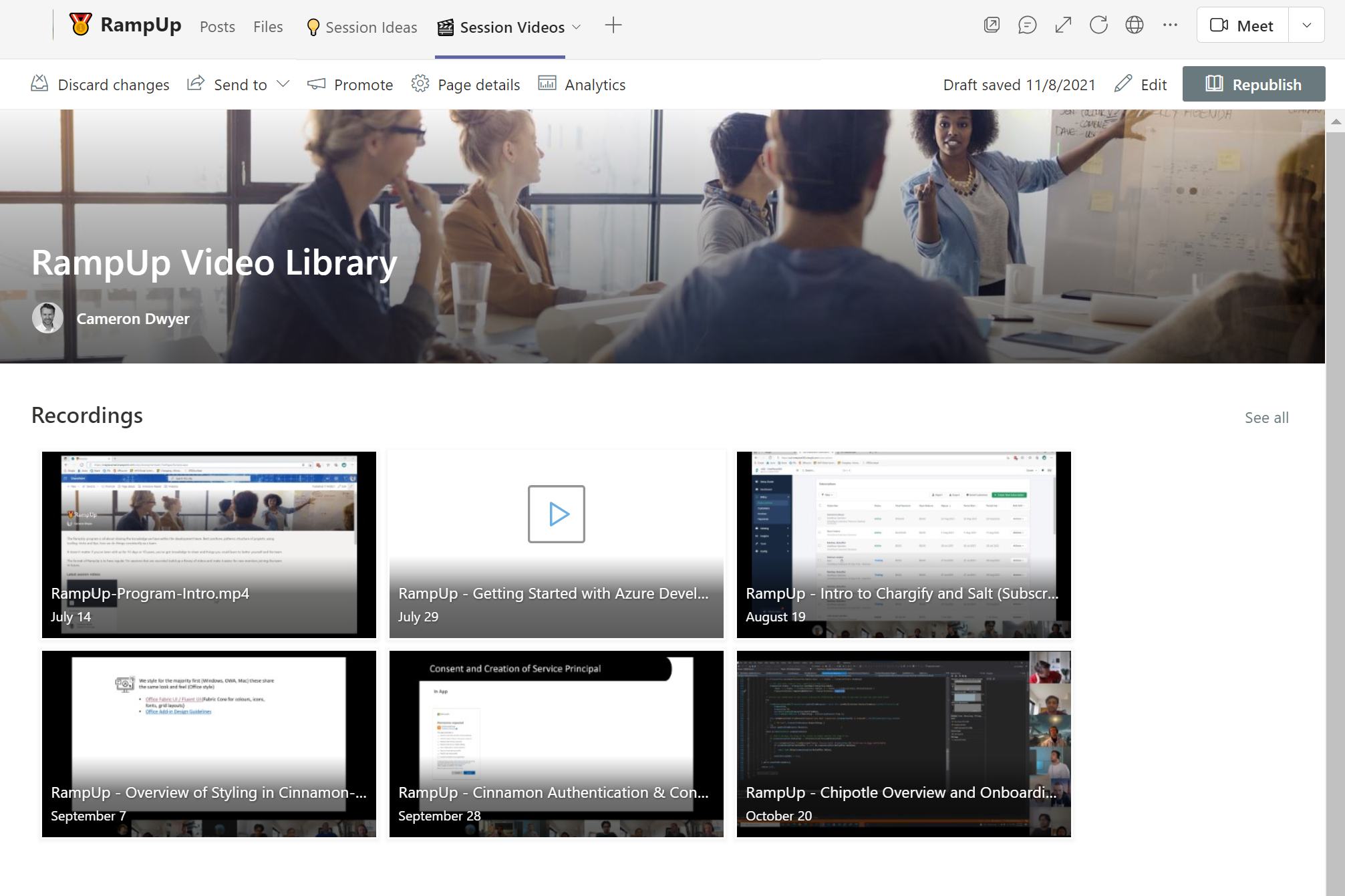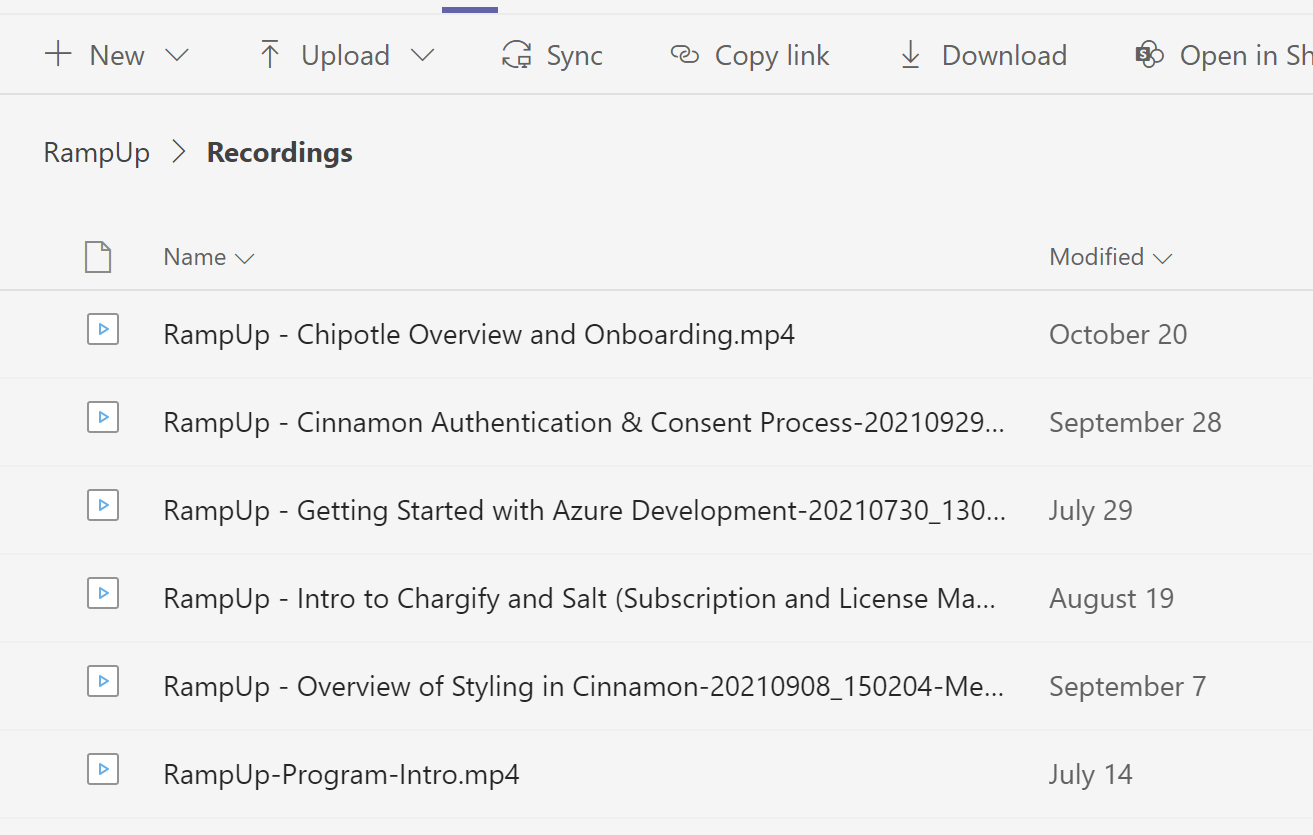 The important thing to note is that by scheduling the meeting directly in the RampUp channel, the recordings will automatically get saved into the same folder within the Documents library of the Team site.