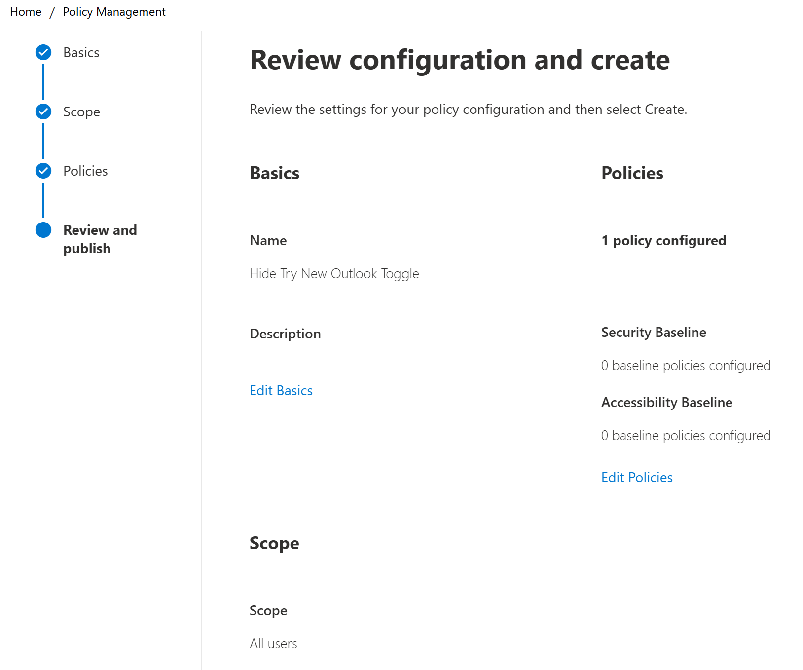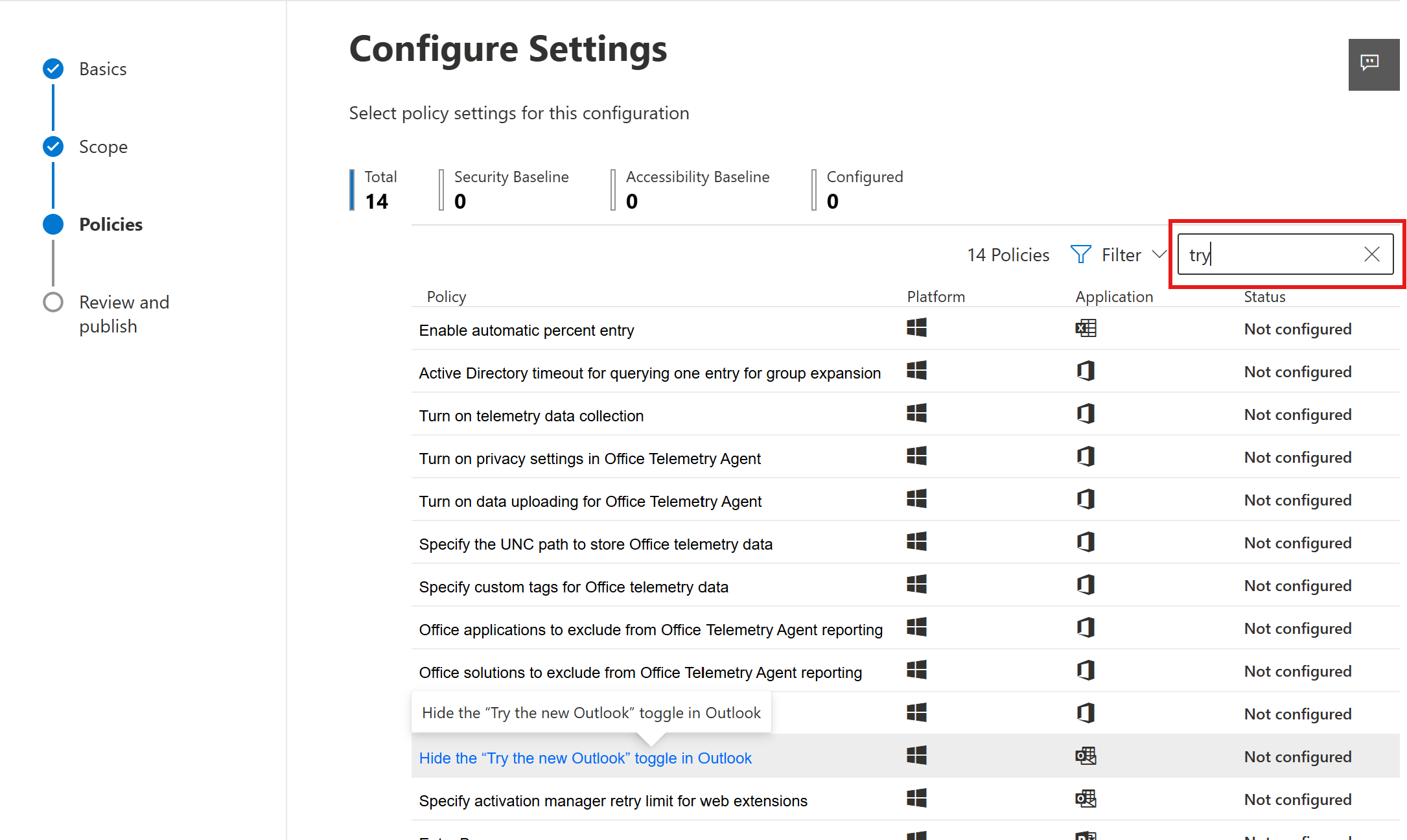 Select the Hide the “Try the new Outlook” toggle in Outlook policy. Hint: That search box in the top right corner is your friend and will let you find this policy quickly!