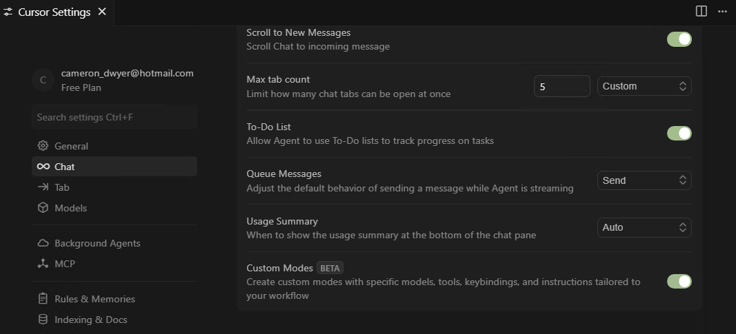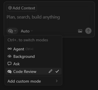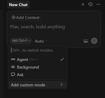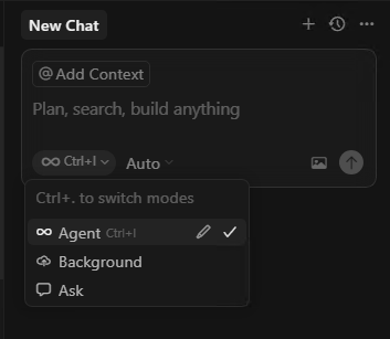 Cursor Custom Modes (in beta) now makes this super easy. By default, in the AI chat window you can switch between the default modes of Agent, Background or Ask.