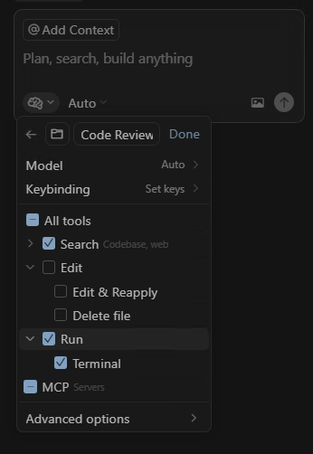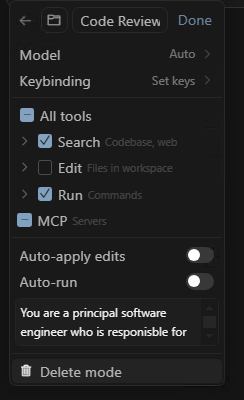 You can also choose which tools are available to this mode. Here I’ve disabled the Edit tools because I don’t want this mode making code changes, I just want it to review.