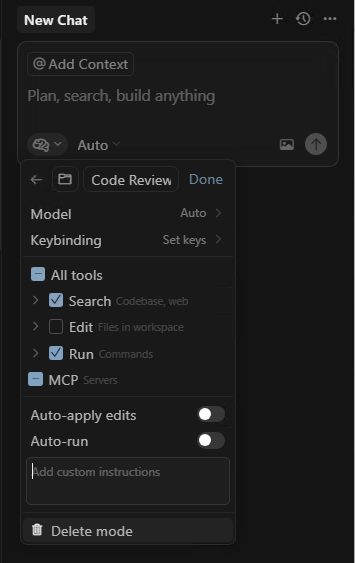 First provide the custom mode name (I’ve set mine to ‘Code Review’), then you can choose to set the model. You can choose a specific model or select Auto which will let Cursor select what it thinks is the most appropriate model at the time.